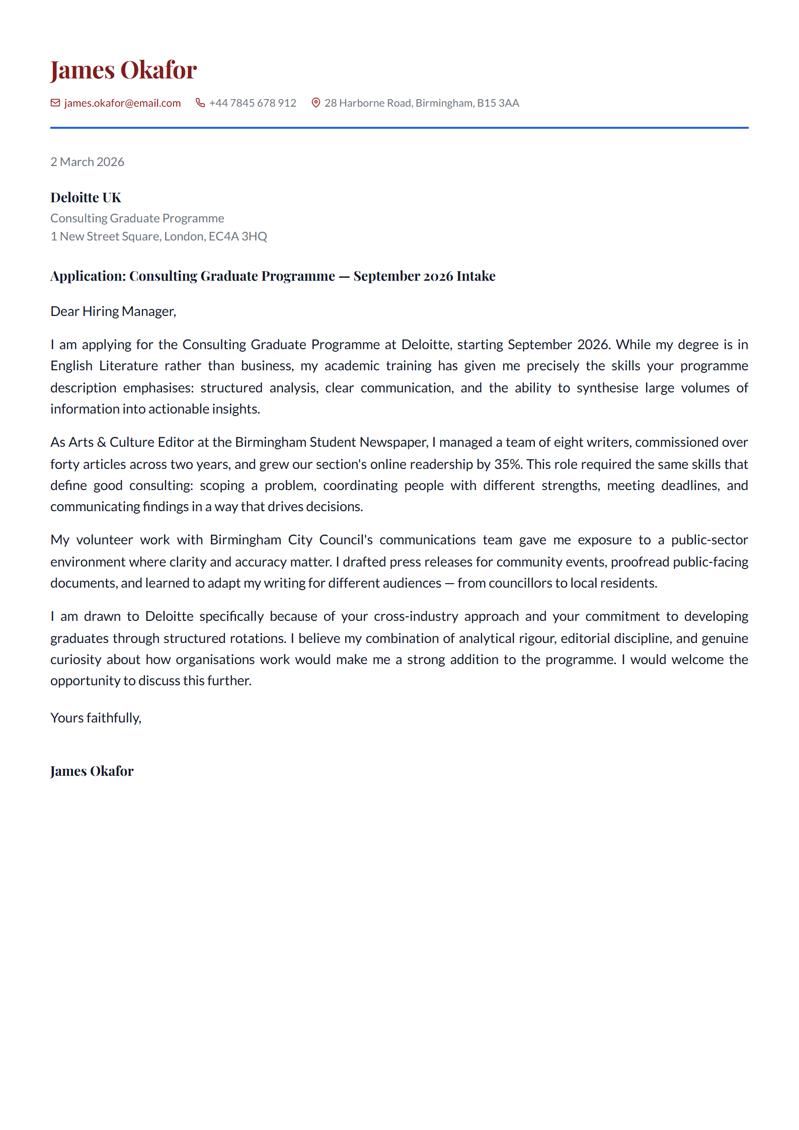 The scenario: James studied English Literature and is applying for Deloitte's Consulting Graduate Programme. He knows his degree isn't the typical route into consulting, and rather than hiding from that fact, he addresses it directly. The letter is addressed to "Dear Hiring Manager" since Deloitte's application portal doesn't name a specific person.