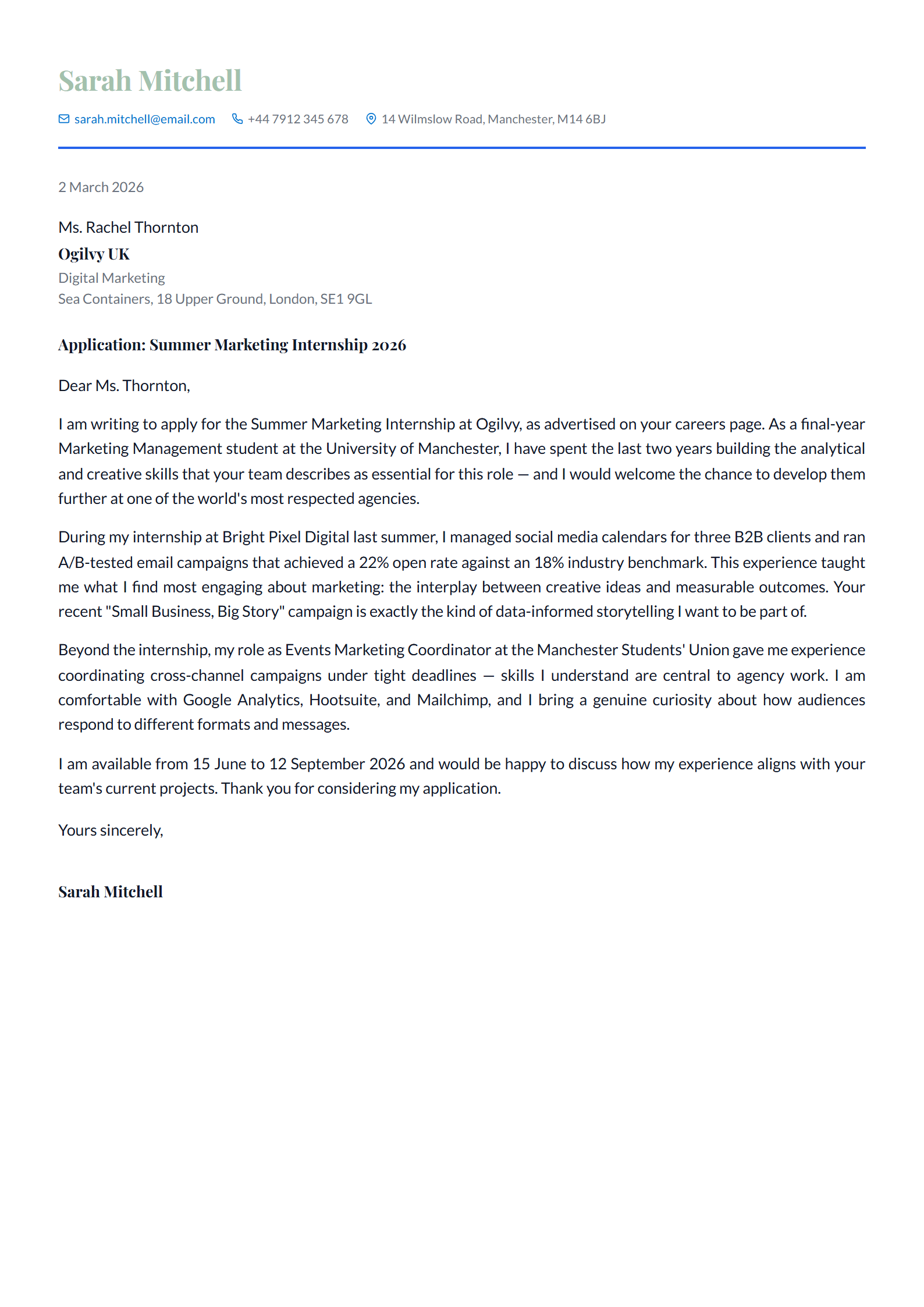 The scenario: Sarah is a final-year Marketing student applying for a Summer Marketing Internship at Ogilvy UK. She has one previous internship at a smaller digital agency (Bright Pixel Digital) and is addressing her letter to Ms. Rachel Thornton, the hiring manager listed in the job posting.