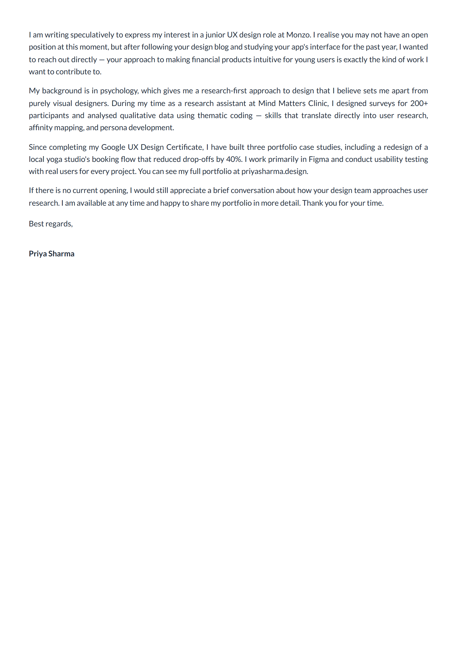 Her product knowledge is concrete. She references Monzo's design blog and their approach to user research, which tells the reader she's been paying attention over time, not just glancing at the About page before hitting send. For speculative applications, demonstrated knowledge of the company's work is the single biggest differentiator. It's the difference between "I'd love to work at Monzo" and "I've followed how your team approaches X, and here's why that resonates with my own work."